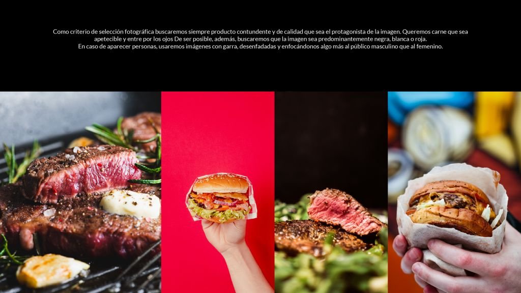 Estrategia de colores aunque esencialmente roja, usamos una paleta de colores secundaria para el versionado de productos, por ejemplo, verde para la carne “eco”, negro para “burgers”, etc.