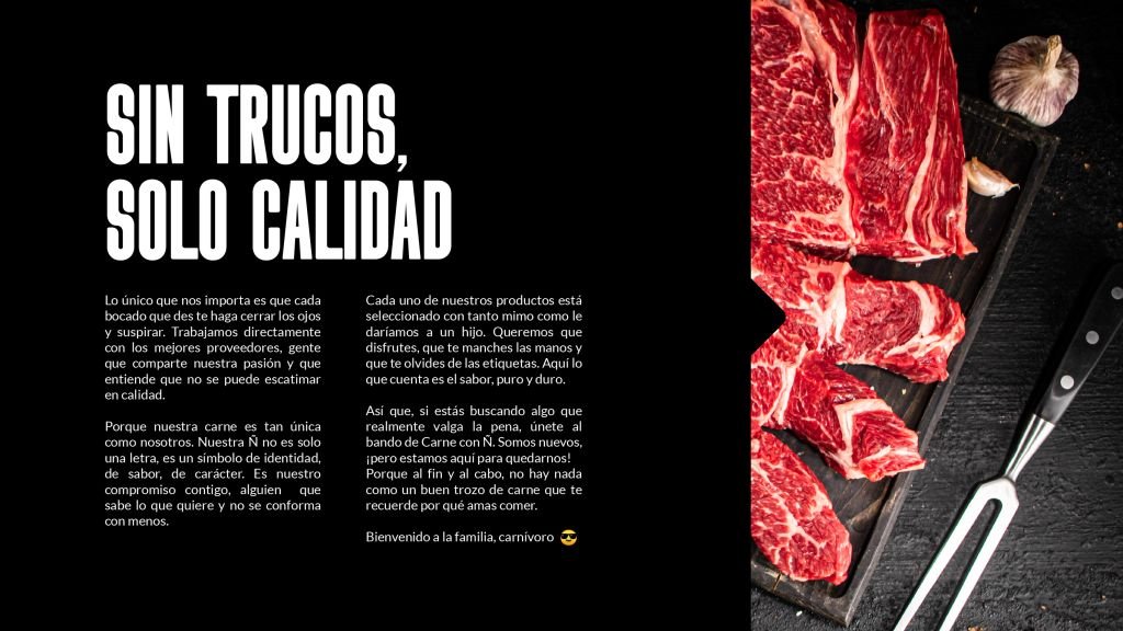 El punto de partida del proyecto fue uno de los momentos más emocionantes del proceso: el naming. Tras muchas rondas de exploración creativa, pruebas fonéticas y validaciones estratégicas, nació Carne con Ñ. Un nombre que juega con el lenguaje y con el alma.