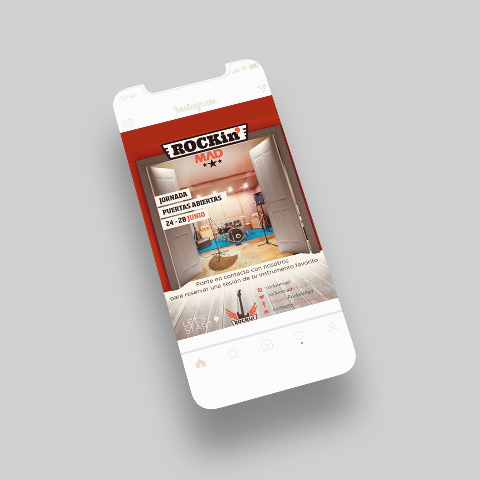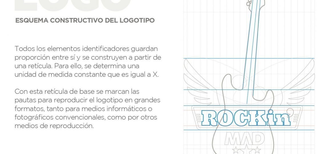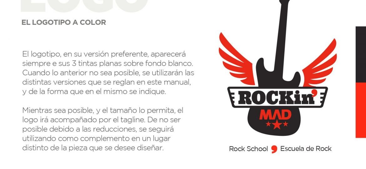 Aunque teniamos muy presente la palabra ‘Rock’ (un must para que el naming nos ayude a posicionarnos) tuvimos que hacer un breve trabajo de naming para dar con el nombre de esta escuela de rock, un nombre que tuviera un dominio.com libre para su registro, así como los nombres de usuarios para redes sociales. El proyecto de Naming le dió forma a algo que salió en la primera ronda de presentación: Rockin’ MAD. Que significa rockeando en Madrid o Rock en Madrid, para las futuras franquicias (o submarinas) designamos que se mantendrían las abreviaturas internacionales formados por 3 letras de la ciudad, para una posible Rockin’ BCN o Rockin’ VLN para Barcelona, Valencia o cualquier ciudad que quisiese abrir su propio centro.