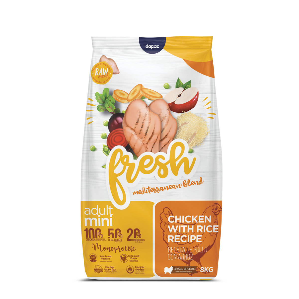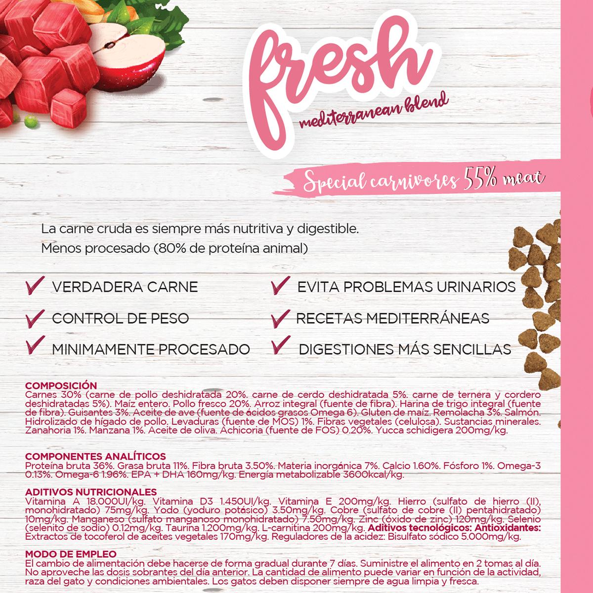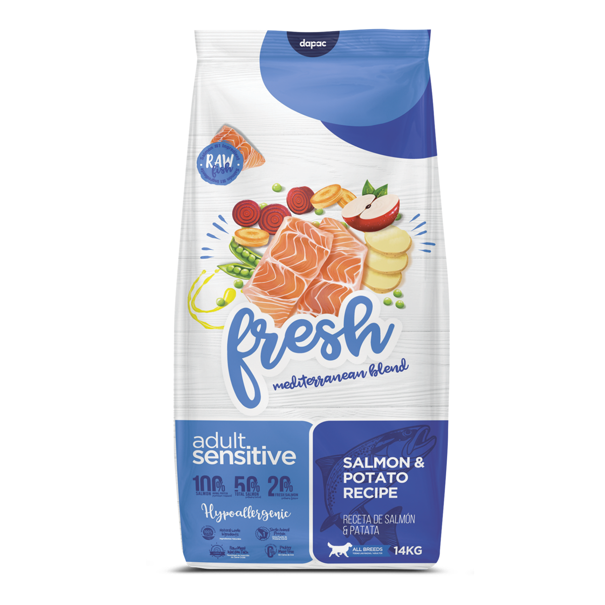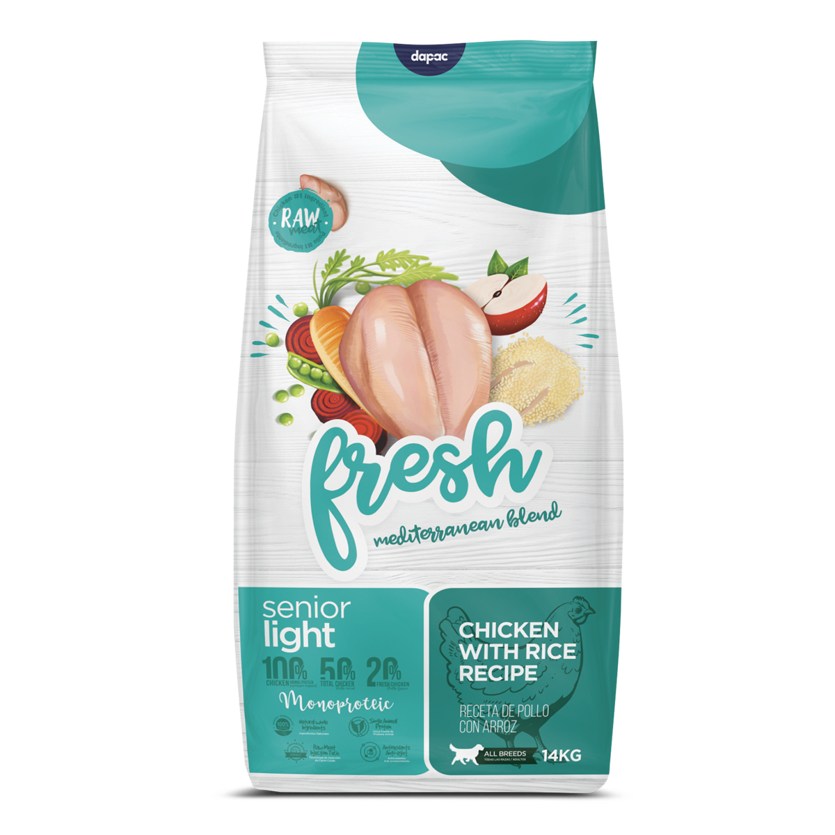 Además de huir de los típicos clichés de colocar una foto de un perro en el frontal, y de realizar nuestras propias ilustraciones, quisimos hacer un diseño fresco, informando en el panel trasero con una infográfica muy ilustrada de los componentes de la receta, informar de las nuevas propiedades del producto y validar con el cliente cada color utilizado, creando una estrategia de colores pantone para las 6 referencias o packaging sku’s de pienso para perros más 3 referencias o packaging su’s para la linea de gatos. El resultado una familia de productos más amplia, un diseño diferenciador y que comunica sin apoyos externos las propiedades de la nueva linea fresh ya que el packaging es la relación más directa que puede haber entre el producto y su comprador.