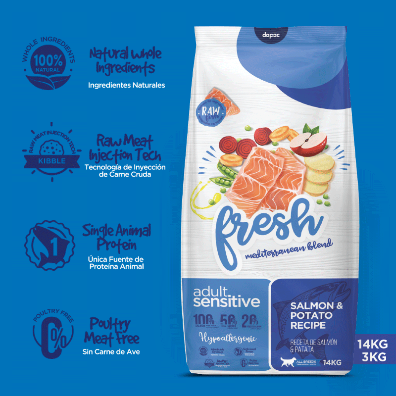 Antes de abordar cualquier diseño, nos gusta conocer del porqué del cambio. Se trata de un cambio de fórmula o receta? Ha cambiado el mercado? Ha cambiado el tipo de consumidor? En este caso, como lo comentamos no se trataba solo de un refrescamiento de imagen sino que la receta mejoró del todo incluyendo alimentos mas frescos en su elaboración, de ahi el nombre de Fresh. Si nos llamaba la atención del porqué el naming de la marca era ‘ANC Fresh’ pero tras hablar con varios dueños de tiendas y retails pocos sabían que las siglas pertenecían al ?Alimento Natural Completo’ por lo que decidimos emprender un registro de nueva marca y renovación del logotipo a tan solo ‘Fresh’, como claim dejamos tan solo el Mediterranean blend para hacerle justicia a los nuevos ingredientes de la fórmula. Además de una auditoria visual previa de los productos, entendimos que esta categoría de Pet Food hay colores que seguir como estándar. Si el principal activo de diferenciación de un producto con respecto a otros de su familia es el color: replantear ¿realmente estamos usando los colores correctos?.