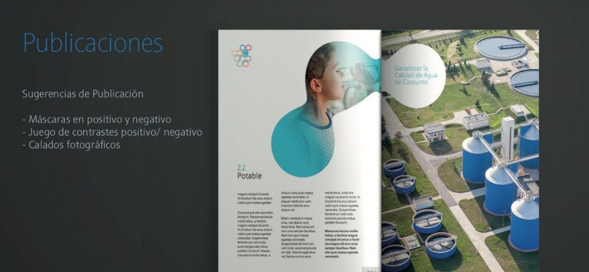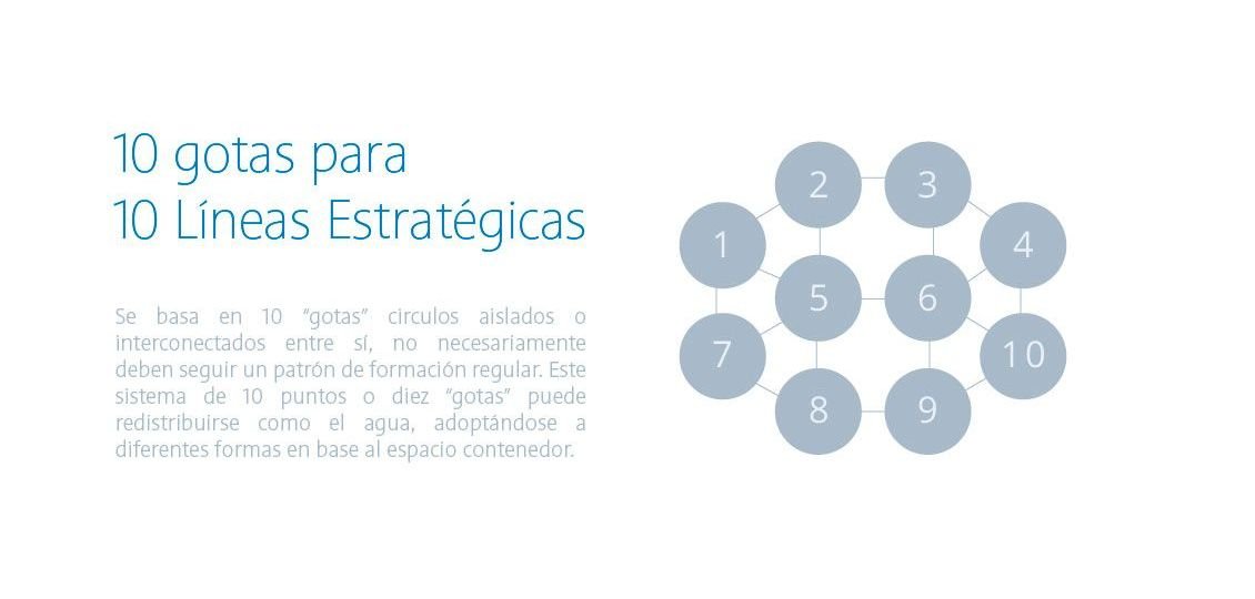 Tras la ronda de conceptualización y bocetos, nos validaron el diseño de un Sistema de 10 Gotas, tratándose de la empresa estatal de la gestión del agua, pensamos que no había un sistema más flexible que el de las gotas de agua que se unan o separen en base a una o varias líneas estratégicas unidas o relacionadas.