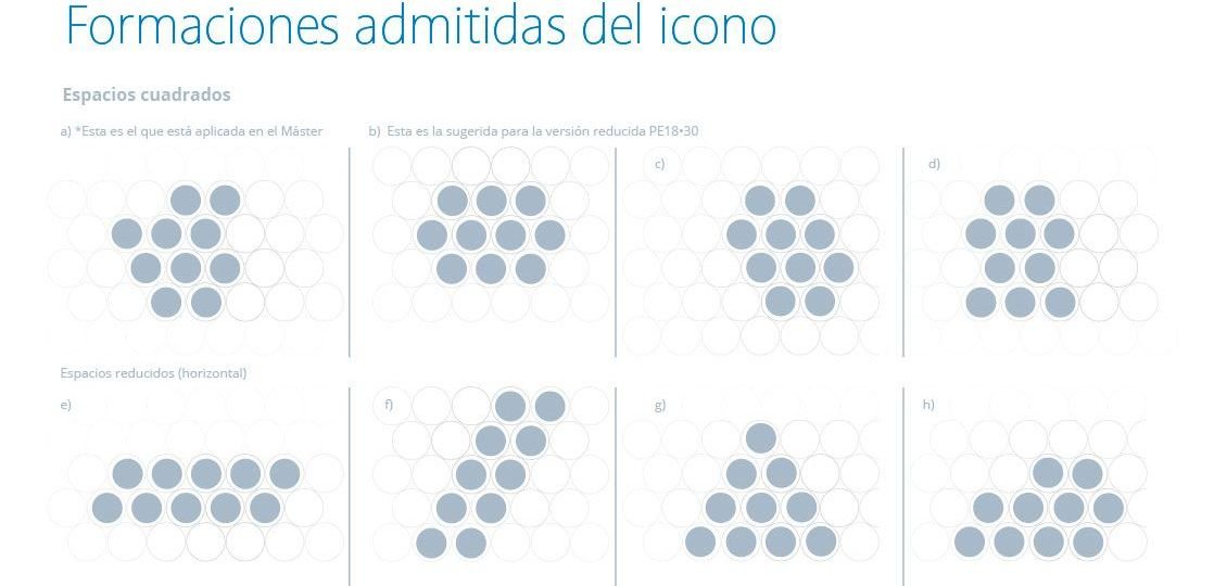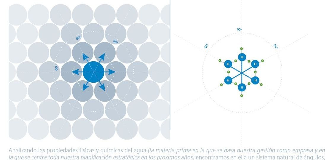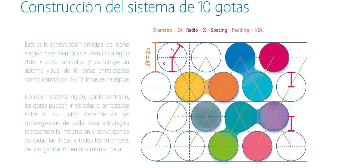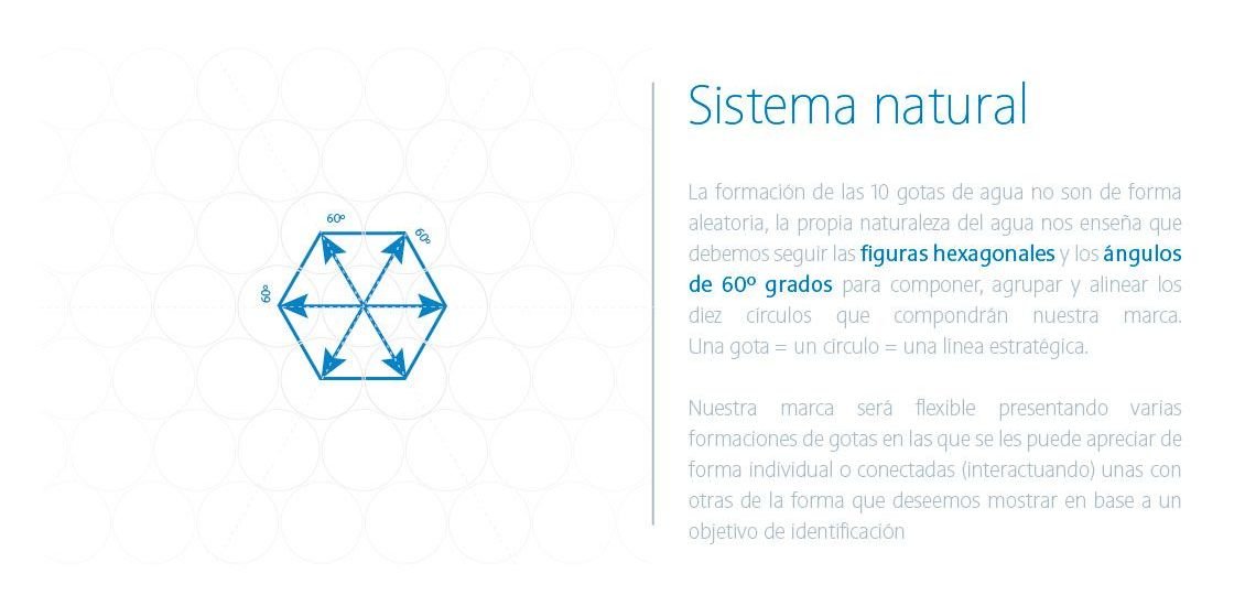 Este sistema de 10 puntos o diez “gotas” puede redistribuirse como el agua, adoptándose a diferentes formas en base al espacio contenedor. La formación de las 10 gotas de agua no son de forma aleatoria usando la propia naturaleza del agua que sigue una formación hexagonal para combinar y alinear este imagotipo.