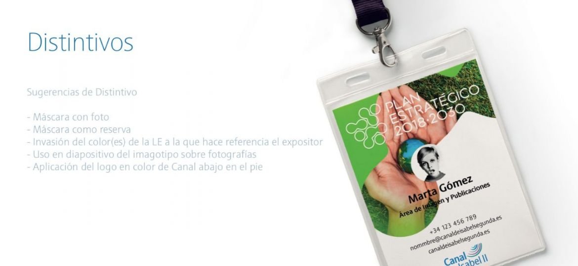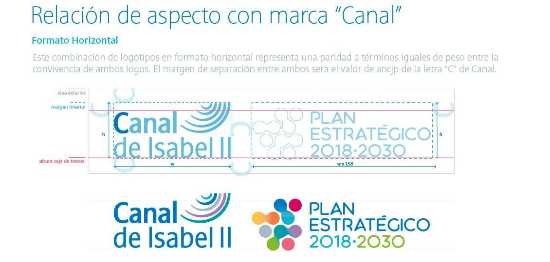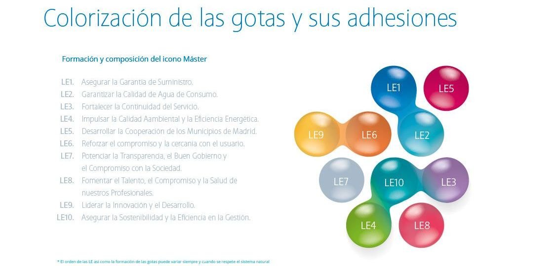 Además de una estrategia global: como el de crear el logotipo central del Plan Estratégico, dentro del planning había que trabajar un objetivo individual: el de definir un color para cada línea estratégica. Canal Isabel II como organización gubernamental para la gestión del agua en la Comunidad de Madrid debe impulsar sus valores como la eficiencia, el compromiso, la cercanía, la transparencia, la innovación, el talento y la sostenibilidad económica y medioambiental. Cada uno de estos valores tiene una misión y un Plan Estratégico para el período 2018-2030. Para ayudar a comunicar sus objetivos y alinear a sus trabajadores y proveedores en las acciones necesarias para lograrlos en el medio y largo plazo.