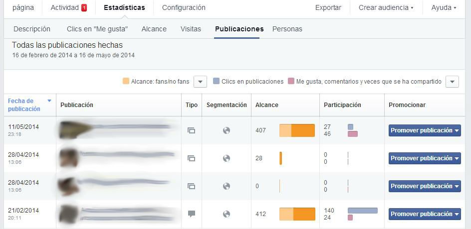 - Publicaciones y su Repercusión. Para saber qué comentarios, videos o archivos han tenido efecto solo tenemos que echar un vistazo a la pestaña ALCANCE. Este indicador simplemente se refiere al número de personas que han visto la información que hemos compartido. Si desplegamos la pestaña alcance podremos seleccionar entre Orgánico/Pago y Fans/no fans, esto es especialmente útil para ver qué es lo que realmente tiene interés para nuestros seguidores y nuestros potenciales seguidores.